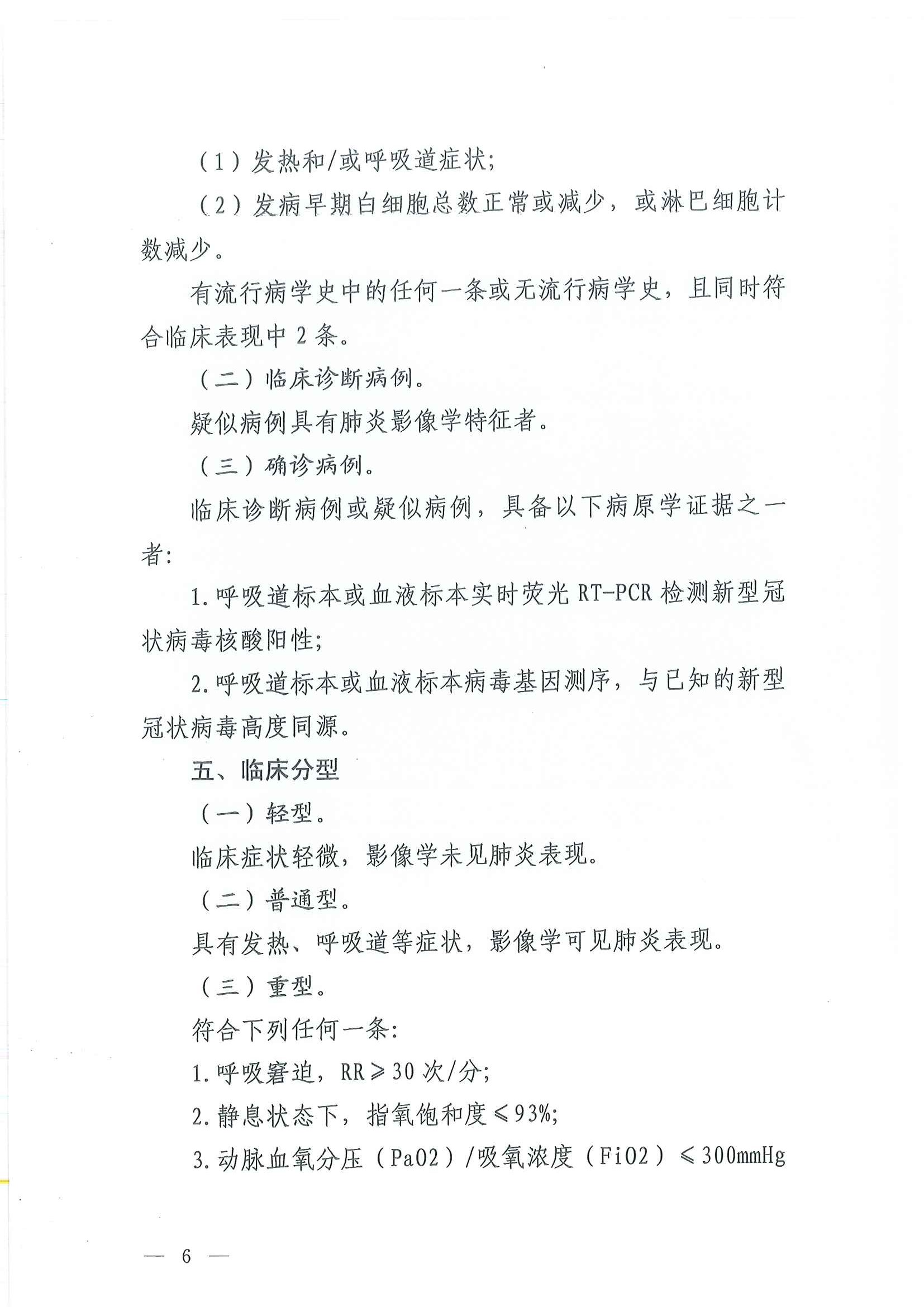 第五,临床分型。根据是否有临床症状、是否有肺炎、肺炎的严重程度、是否出现呼吸衰竭、休克、有无其他器官功能衰竭等分为轻型(临床症状轻微,影像学未见肺炎表现);普通型(发热、呼吸道等症状,影像学可见肺炎表现的);重型(呼吸窘迫,RR≥30次/分;静息状态下,指氧饱和度≤93%;动脉血氧分压(PaO2)/吸氧浓度(FiO2)≤300mmHg)和危重型(出现呼吸衰竭,且需要机械通气;出现休克;合并其他器官功能衰竭需ICU监护治疗。)