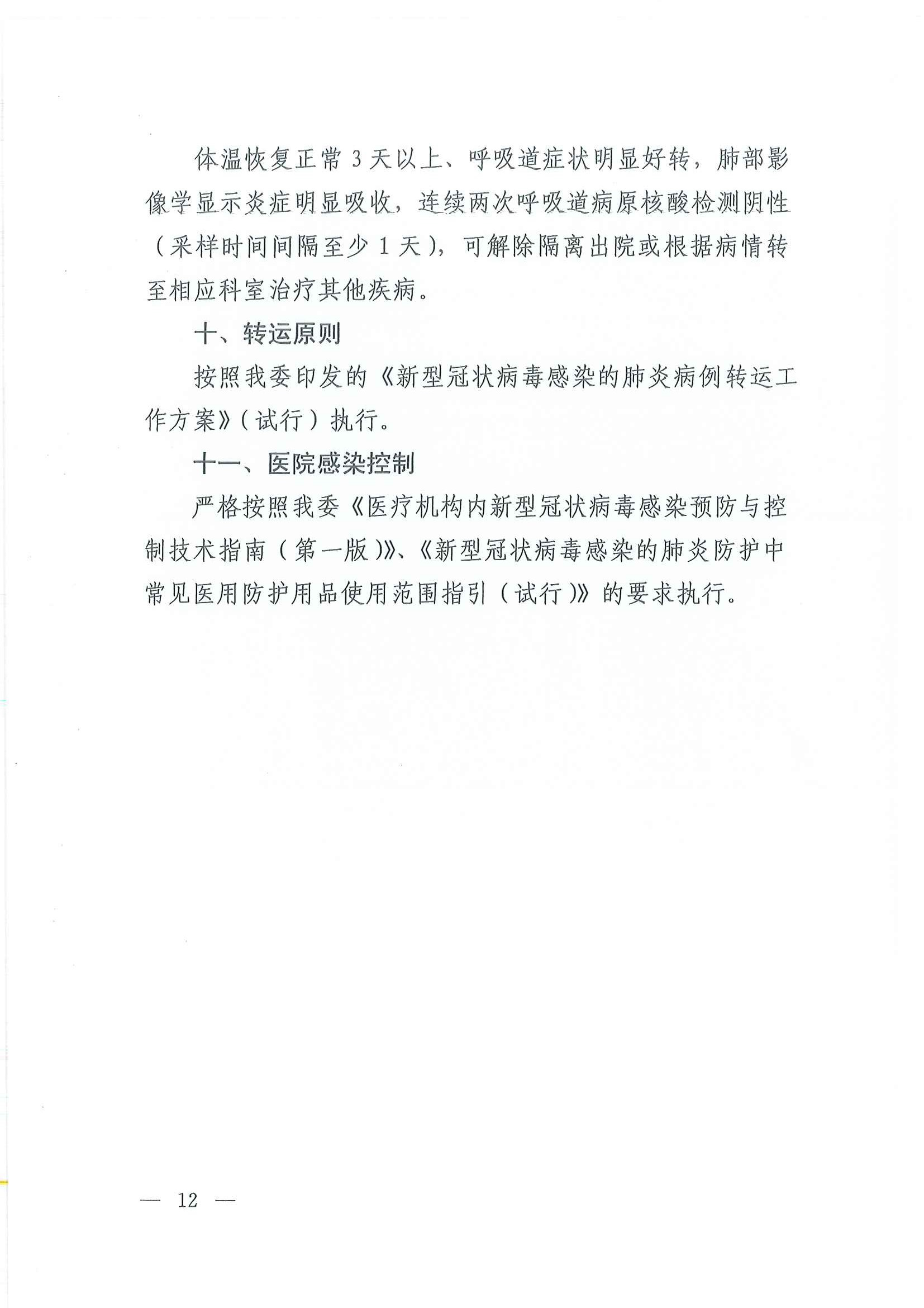 第九,解除隔离和出院标准。在“体温恢复正常3天以上、呼吸道症状明显好转”基础上,增加“肺部影像学显示炎症明显吸收”,连续两次呼吸道病原核酸检测阴性(采样时间间隔至少1天),可解除隔离出院或根据病情转至相应科室治疗其他疾病。