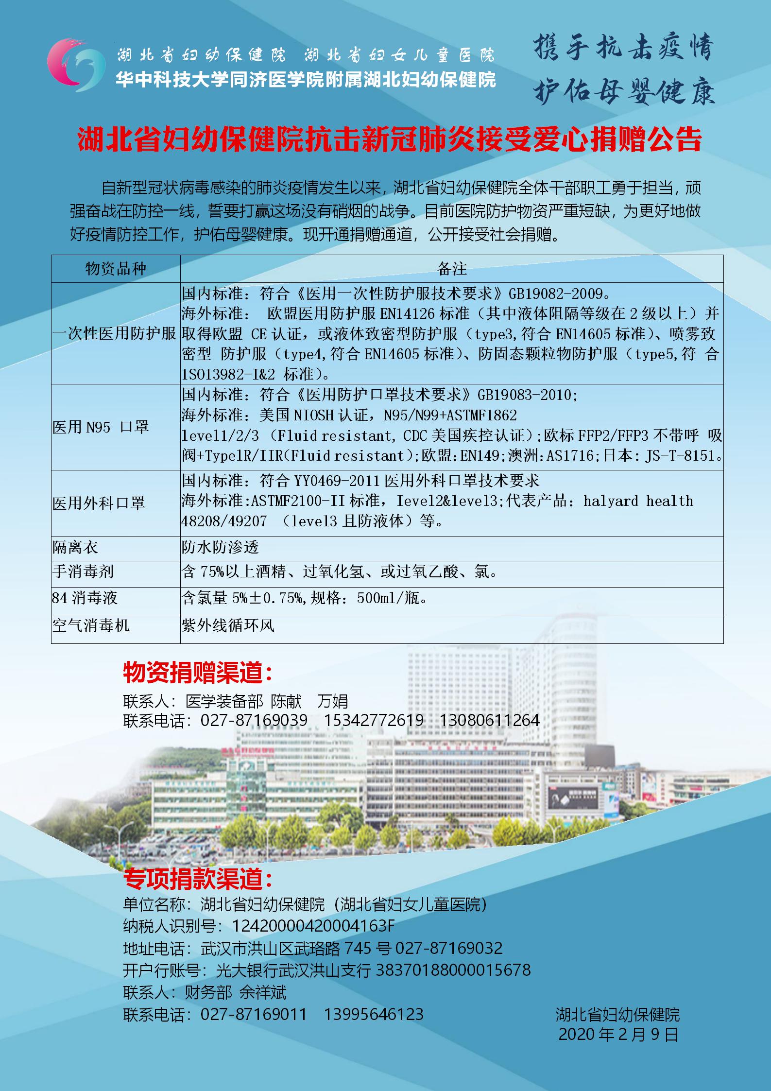 湖北省妇幼保健院抗击新冠肺炎接受爱心捐赠公告