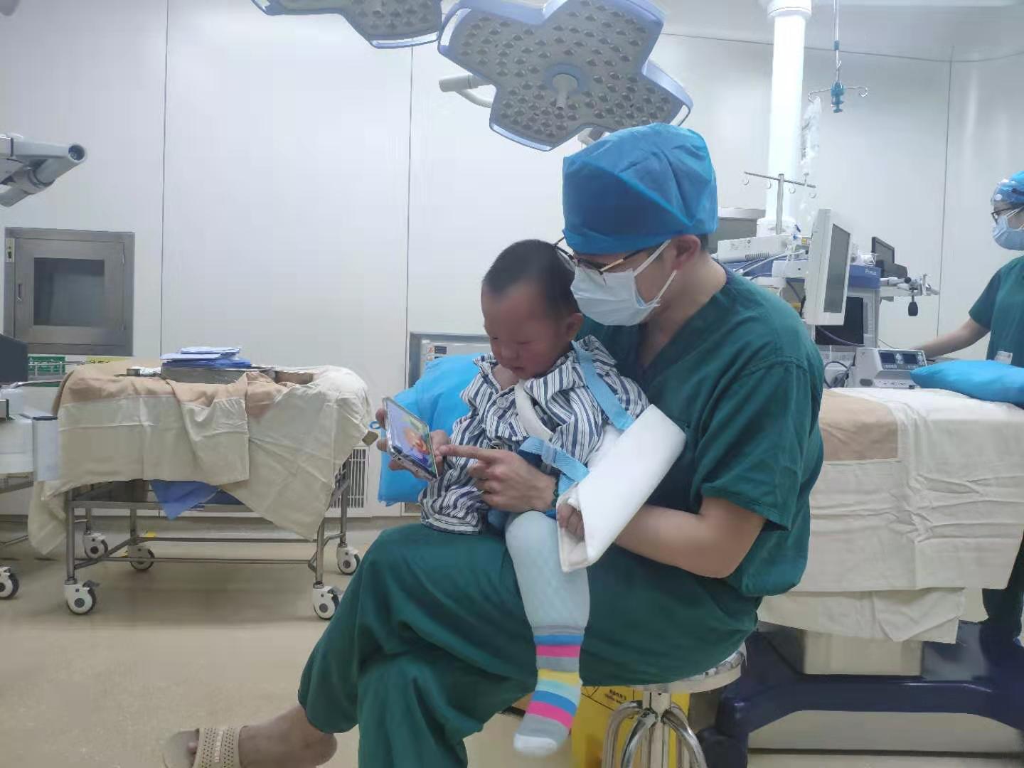 骨科医生杨超在手术室给1岁多的患儿进行心理疏导