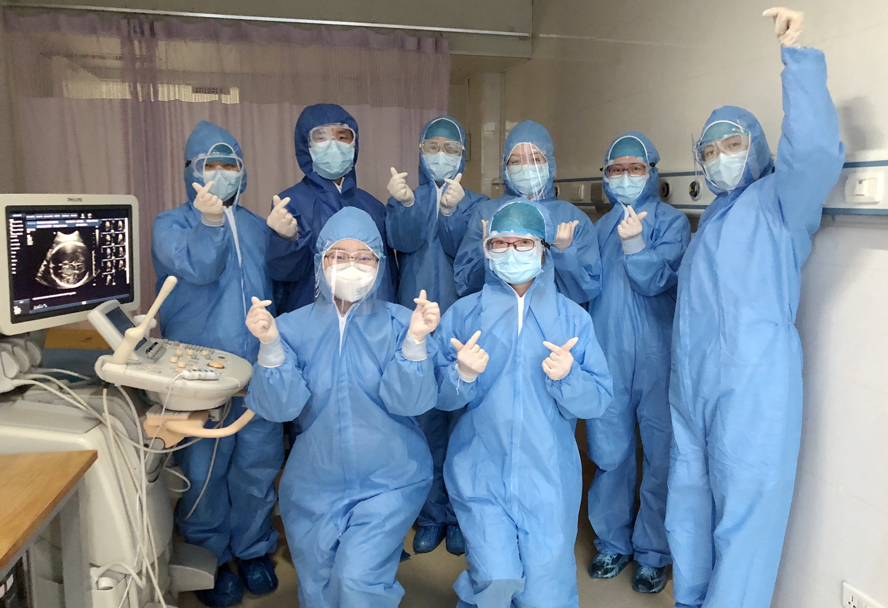 中午12:00正准备下班,出诊通知来了,新生儿ICU有个孩子腹痛需要床边急诊。病房出诊不能耽搁,于是我快速赶往ICU病房。到了ICU,在隔离服外又套了一件新生儿科干净的隔离服。进门我被告知有5个孩子需要做检查。我和新生儿科护士商量说,因为内急,能不能现在只做急诊,下午再来做其他孩子的。他们一听急了,都笑着围着我说:“你们来病房出诊一次,我们就要给出诊医生提供一套隔离衣,都是把最好的留给你们,不能浪费呀。下午再来,我们又提供一套隔离衣,而这些我们都舍不得用的啊!”对于防护物资的缺乏我也是感同身受,继续加油坚持。