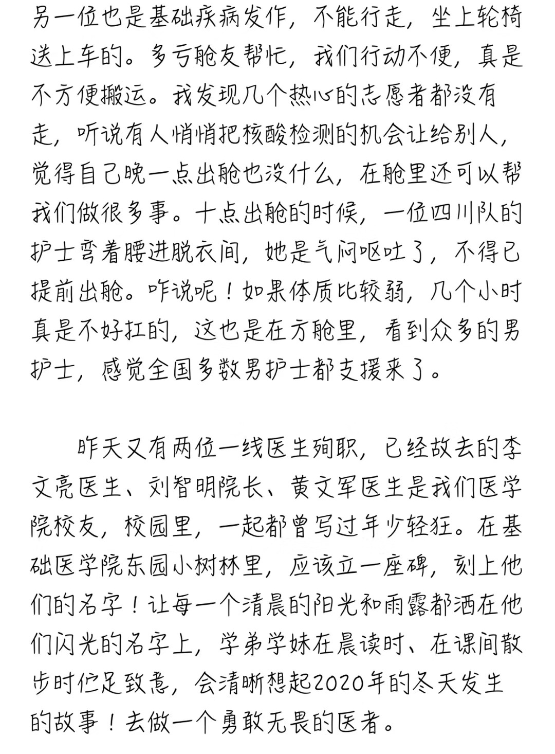 昨天又有两位一线医生殉职,已经故去的李文亮医生、刘智明院长、黄文军医生是我们医学院校友,校园里,一起都曾写过年少轻狂。在基础医学院东园小树林里,应该立一座碑,刻上他们的名字!让每一个清晨的阳光和雨露都洒在他们闪光的名字上,学弟学妹在晨读时、在课间散步时伫足致意,会清晰想起2020年的冬天发生的故事!去做一个勇敢无畏的医者。
